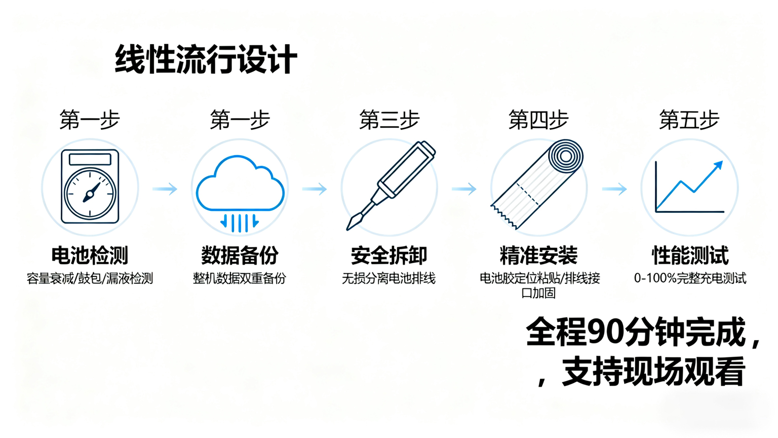 服务前提供清晰报价,维修过程可见。更换后的电池提供180天质保,并附赠电池使用保养建议。