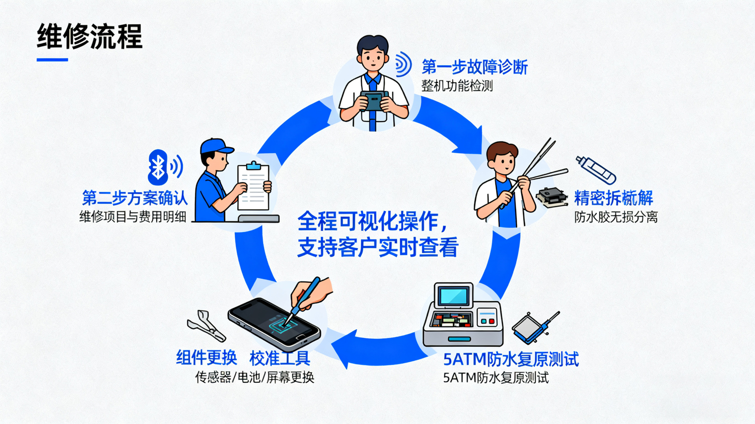我们提供精密的维修保养服务,通过原厂级配件与微米级工艺,助您快速恢复设备的完整功能,延续健康监测与智能提醒的贴心陪伴。