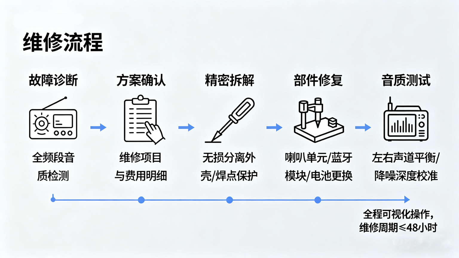 严格选用原装或认证音频配件,包括扬声器单元、线材、电池、接口模块等,确保维修后的频响范围、阻抗特性与原始音质一致。
